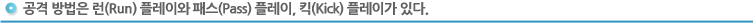 Çѹø¿¡ ¸¹Àº °Å¸®¸¦ ÀüÁø ÇÒ ¼ö ÀÖÀ¸³ª »ó´ë¿¡°Ô º¼À» »©¾Ñ±â¸é Àϼø°£¿¡ °ø°ÝÀ» »©¾Ñ±â°Ô µÈ´Ù. ±×¸®°í ÆÐ½º Ç÷¹ÀÌ´Â ½ÇÆÐ ÇÒ È®·üÀÌ ³ô´Ù. ÆÐ½º Ç÷¹À̰¡ ½ÇÆÐ·Î ³¡ÀÌ ³ª¸é ´ÙÀ½ÀÇ °ø°ÝÀº ¹Ù·Î Àü¿¡ ½ÃÀ۵Ǿú´ø ÁöÁ¡¿¡¼ ´Ù½Ã °ø°ÝÀÌ ½ÃÀ۵ȴÙ. ±×·¯³ª ´Ù¿îÀÇ È½¼ö´Â ´ÙÀ½À¸·Î ³Ñ¾î°£´Ù. ±×·¯³ª ¹Ì½ÄÃ౸ÀÇ Âü ¸ÀÀ» Áñ±æ ¼ö ÀÖ´Â È·ÁÇÑ Ç÷¹ÀÌ´Ù.