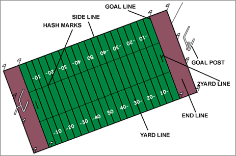 ¹Ì½ÄÃ౸ ±¸ÀåÀº ±æÀ̰¡ 108m(120 ¾ßµå), ÆøÀÌ 48m(160 ÇÇÆ®)ÀÎ Á÷»ç°¢ÇüÀÌ´Ù. ¶ÇÇÑ ¹Ì½ÄÃ౸±¸ÀåÀº ¾ØµåÁÔ(10 ¾ßµå * 53 ¨÷ ¾ßµå)°ú °æÁöÀå(100 ¾ßµå * 53 ¨÷ ¾ßµå)·Î ³ª´©¾î Áø´Ù. ¾ØµåÁÔ¿¡´Â °ø°ÝÆÀÀÇ ¼±¼ö°¡ º¼À» °¡Áö°í µé¾î°¡°Å³ª ¾Øµå¶óÀÎ »ó¿¡ ¼¼¿öÁ® ÀÖ´Â °ñÆ÷½ºÆ®ÀÇ H-¹Ù »çÀ̷ΠűÀ» ÇßÀ»¶§ °øÀÌ ³Ñ¾î°¡¸é µæÁ¡ÀÌ µÈ´Ù. ¾ØµåÁÔ¿¡´Â °ñ¶óÀÎÀÌ Æ÷ÇÔµÇ¸ç °ñ¶óÀÎ »ó¿¡ ÀÖ´Ù°í »ý°¢ÇÏ´Â ¼öÁ÷ Æò¸éÀ§·Î °øÀÌ ½ºÃÆ´Ù°í(Á¢Çß´Ù°í) ÇÏ´Â ¼ø°£¿¡ µæÁ¡(Touch Down)ÀÌ µÈ´Ù. °æ±âÀå¿¡ÀÇ ¾çÂÊ °ñ¶óÀÎ »çÀÌ¿¡´Â 5¾ßµå ¶óÀÎÀÌ °ñ¶óÀΰú ÆòÇàÇÏ°Ô ±×¾îÁ® ÀÖ´Ù. ¹Ì½ÄÃ౸¿¡¼ 10¾ßµå´Â ÆÛ½ºÆ®´Ù¿îÀÇ È¹µæÀ» À§ÇÑ ÇʼöÀüÁø°Å¸®(4ȸÀÇ °ø°Ý¿¡¼ ÃÑ ÀüÁøÇÑ °Å¸®) À̱⠶§¹®¿¡ 10¾ßµåÀÇ Ç¥½Ã´Â °æ±âÁøÇàÀ» ÇÏ´Â µ¥ÀÇ Ä¿´Ù¶õ ÁöÇ¥°¡ µÈ´Ù. ¾ßµå ¶óÀο¡ ¾²¿©Á® ÀÖ´Â ¼ýÀÚ´Â µÎ °ñ¶óÀο¡¼ÀÇ °Å¸®¸¦ ³ªÅ¸³»°í ÀÖ´Â °ÍÀ¸·Î 50 ¾ßµå°¡ ÇʵåÀÇ Áß¾ÓÀÌ µÈ´Ù. °ñÆ÷½ºÆ®´Â ¾Øµå¶óÀÎ ¼±»óÀÇ Áß¾Ó¿¡ À§Ä¡Çϴµ¥ 20 ÇÇÆ®(¾à 6m)ÀÌ»óÀÌ µÇ´Â µÎ°³ÀÇ ¸·´ë¸¦ ¼¼¿ì°í Áö»óÀ¸·Î ºÎÅÍ ¾à 3mÀÇ ³ôÀÌ¿¡ Å©·Î½º¹Ù(Cross Bar)¸¦ ¿¬°áÇϴµ¥ ÆøÀº 5.55m(18ÇÇÆ® 6ÀÎÄ¡)ÀÌ´Ù. Çʵå°ñÀ» ½ÃµµÇÒ ¶§¿¡ °ø°Ý ÆÀÀÇ Å±Ä¿°¡ Âù º¼ÀÌ ÀÌ Å©·Î½º¹Ù¸¦ ³Ñ¾î°¡¸é 3Á¡ÀÇ µæÁ¡ÀÌ µÈ´Ù.