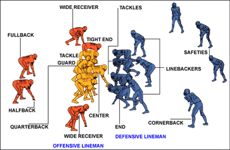¹Ý¸é ¼öºñÆÀ¿¡´Â 4¿¡¼ 5¸íÀÇ ¼öºñ ¶óÀθǰú 3~4¸í Á¤µµÀÇ ¶óÀιèÄ¿, 2~3¸í Á¤µµÀÇ µðÆÒ½º¹éÀ¸·Î ±¸ºÐÀÌ µÈ´Ù. ¼öºñ ¶óÀθÇÀº Á¦ 1¼±¿¡¼ »ó´ëÆÀÀÇ Èû¿¡ ÀÇÇÑ µ¹ÆÄ¸¦ ÀúÁöÇϸç, ¶óÀιéÄ¿´Â ·¯½Ã¿Í ÆÐ½º¸¦ ¹Ý¹Ý¾¿ ¸Ã°í, µðÆæ½º¹éÀº Á¦ 3¼±¿¡¼ ÆÐ½ºÀÇ ¹æ¾î¸¦ ÁÖ·Î ÇÑ´Ù. ÄÚÀÎ Å佺·Î °ø¼ö ¹× Áø¿µÀ» °áÁ¤ÇÏ¸ç ¼öºñÆÀÀº °ø°ÝÆÀ¿¡°Ô º¼À» Å±ÇØÁÖ°í °ø°ÝÆÀÀº Çãµé(huddle)·Î ÀÛÀüÀ» ¼ö¸³ÇÏ¸ç °æ±â¸¦ ½ÃÀÛ, ÄÚÀÎÅ佺, ű, Çãµé