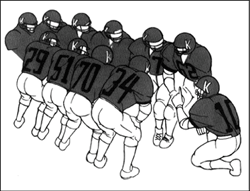 ¾ç ÆÀÀº Ç÷¹À̰¡ ½ÃÀ۵DZâ Àü¿¡ Çãµé(Huddle)À̶ó°í ºÎ¸£´Â ÀÛÀüȸÀǸ¦ ÇÑ´Ù. ÁÖ·Î °ø°ÝÆÀ¿¡¼ ÇàÇÏ´Â °ÍÀε¥ ¸ÅÇ÷¹À̸¶´Ù ¼±¼öµéÀÌ ÇÑÀÚ¸®¿¡ ¸ð¿©¼ ÀÛÀüÀ» Áö½Ã ¹Þ°í Áö½ÃÇÏ´Â ½Ã°£ÀÌ´Ù. ±×·¯³ª ÀÌ ÀÛÀü ½Ã°£Àº 25ÃÊ ³»·Î ÇÑÁ¤ÀÌ µÇ¾î ÀÖ´Ù. °ø°ÝÆÀÀº ½ÉÆÇÀÌ °æ±â ½ÃÀÛÁغñ(Ready for play)ÀÇ ÈÖ½½À» ºÒ°í ³ÈÄ 25ÃÊ ³»¿¡ ´ÙÀ½ÀÇ Ç÷¹À̸¦ ½ÃÀÛÇÏ¿©¾ß ÇÑ´Ù. ¸¸¾à °ø°Ý ÆÀÀÌ Çãµé¿¡ 25ÃÊ ÀÌ»óÀÇ ½Ã°£ÀÌ ¼Ò¿äÇÏ¿´À» ¶§´Â "°æ±âÀÇ Áö¿¬(Delay of game)"À¸·Î 5¾ßµå(Yard, 1¾ßµå´Â ¾à 0.9m) ¹úÄ¢À» ¹Þ¾Æ ÈÄÅ𸦠ÇÏ¿©¾ß ÇÑ´Ù.